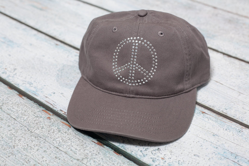 Peace sign rhinestud organic cotton baseball cap - adjustable adult size (silver rhinestuds on charcoal shown in photos). Rhinestuds give just enough bling without being overpowering. You don't even need to be a hippie to wear this peace sign hat.