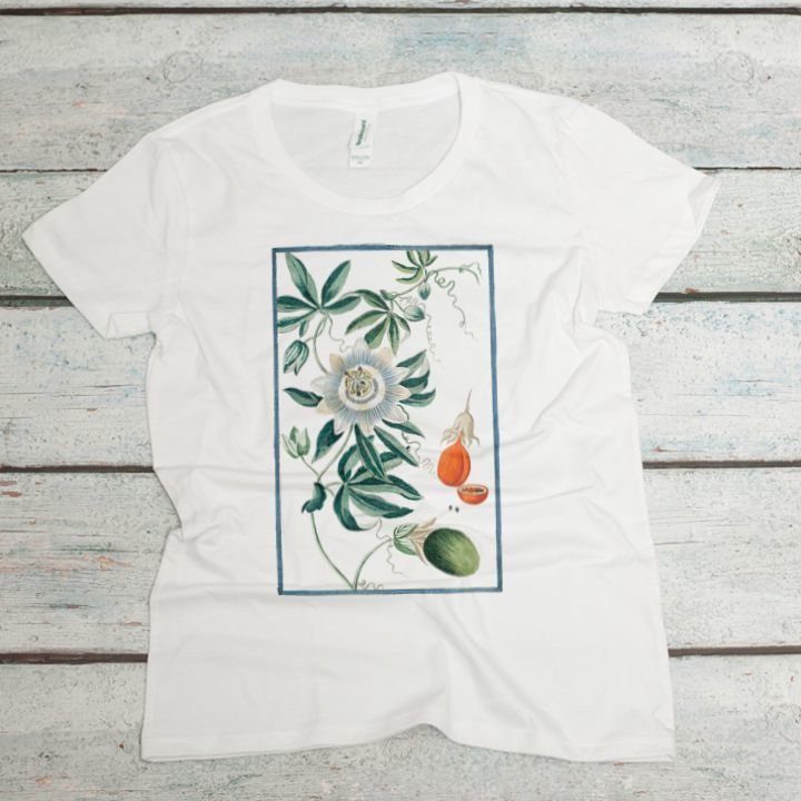 Purple Passionflowers or Maypops (Passiflora incarnata) on a Women's 100% GOTS Certified Organic Cotton T Shirt.